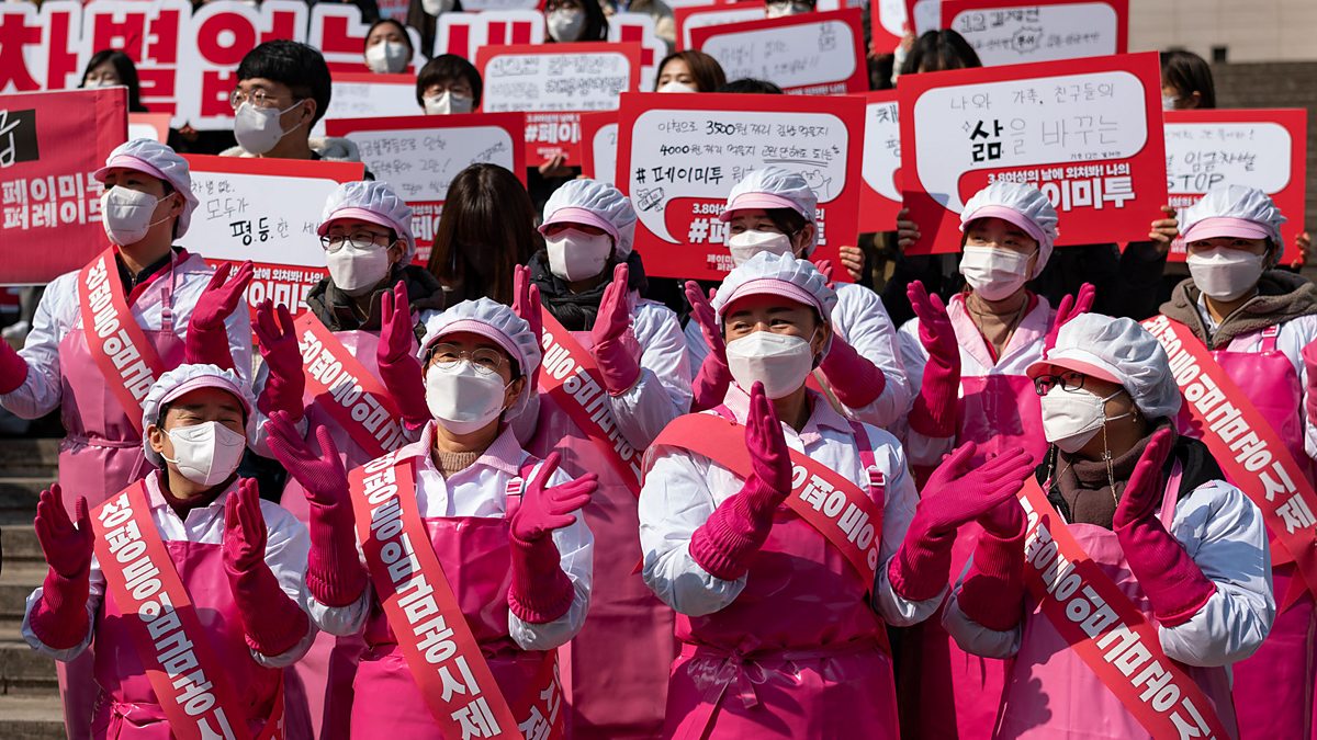 (Photo: Women take part in a march for gender equality on International Women's Day 2022 in Seoul. Credit: Chris Jung/NurPhoto via Getty Images)