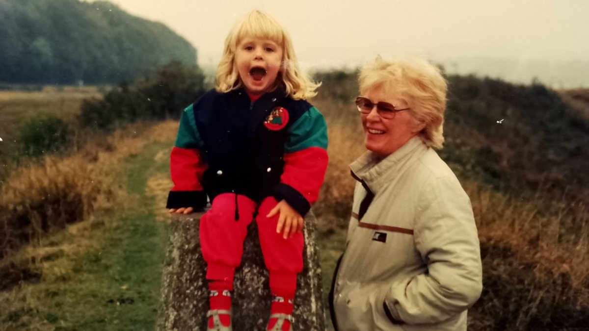 (Photo: A very young Georgie Codd shouting joyfully on a country walk, with her Granny by her side; Photo credit: Georgie Codd)