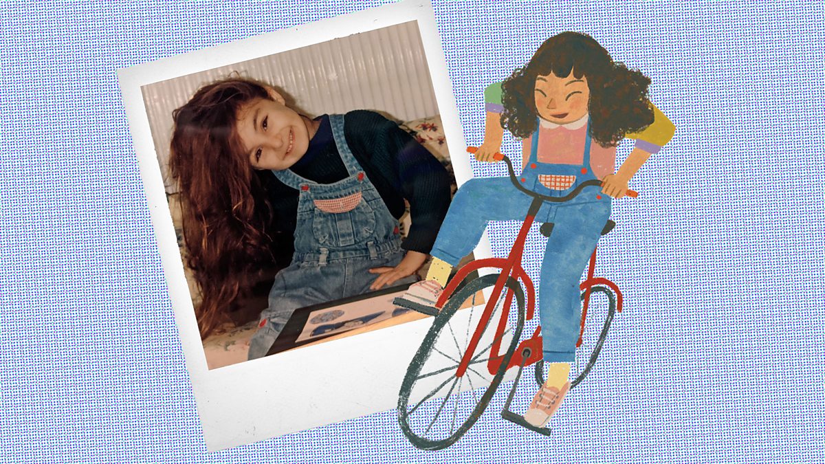 (Photo: Mevan Babakar as a child and an illustration of Mevan and her bicycle. Photo credit: Mevan Babakar; Image credit: Yas Imamura)