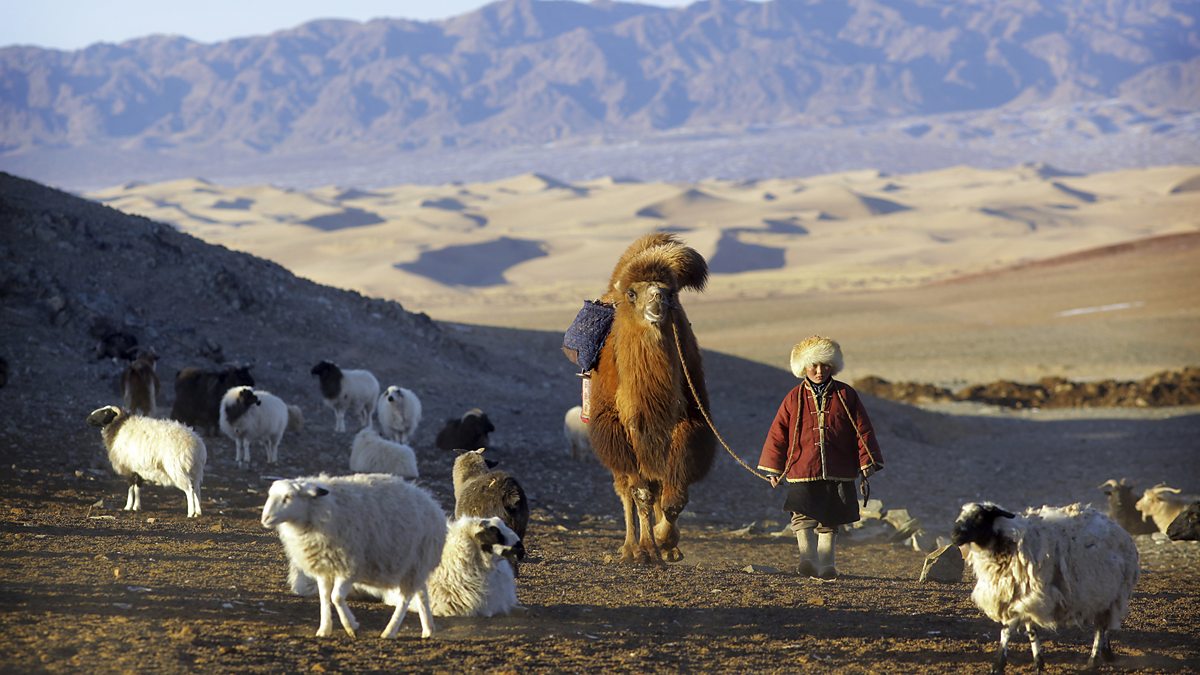 (Photo: A nomadic Mongolian herder leads his camel and livestock over sand dunes beneath the Altai mountains. Credit: Timothy Allen/Getty Images)