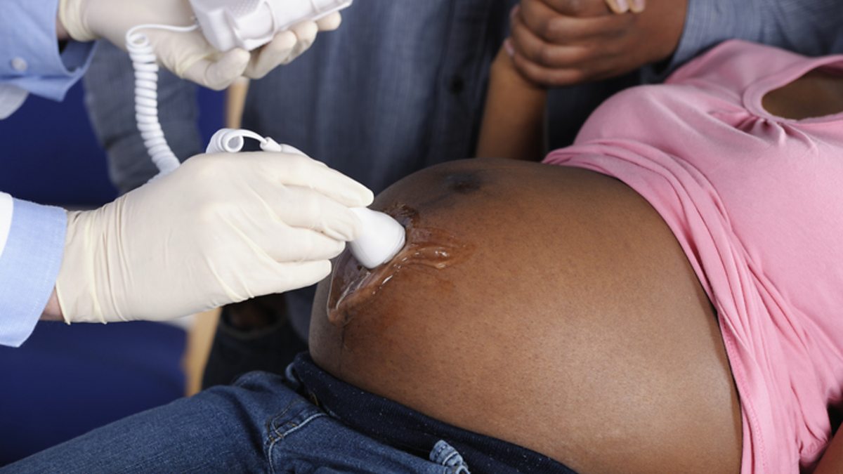 Image description: A close-up of an African American couple having an antenatal assessment