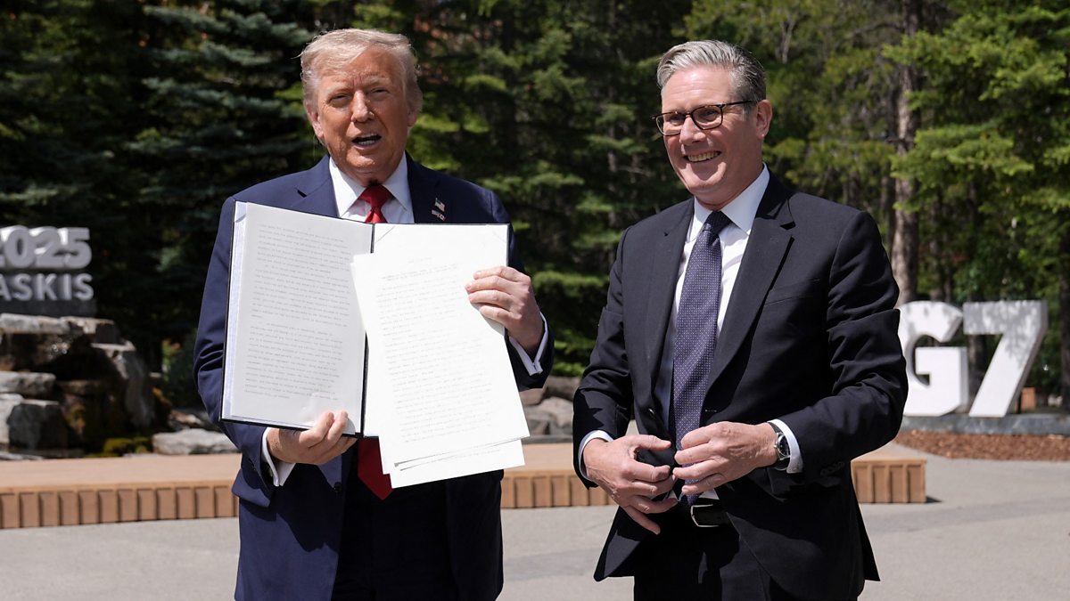 (Picture: US President Donald Trump holds a signed US-UK trade deal next to British Prime Minister Keir Starmer as they speak to reporters during the Group of Seven (G7) Summit at the Pomeroy Kananaskis Mountain Lodge in Kananaskis, Alberta, Canada on June 16, 2025. Credit: Getty Images)