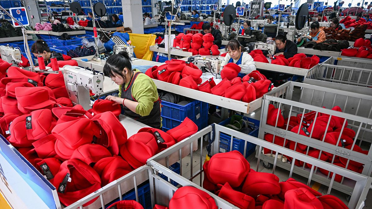 (Image: Employees work on a production line of caps that will be exported to the US at a factory in Suqian, in eastern China's Jiangsu province on 7 April 2025. Credit: Getty Images)