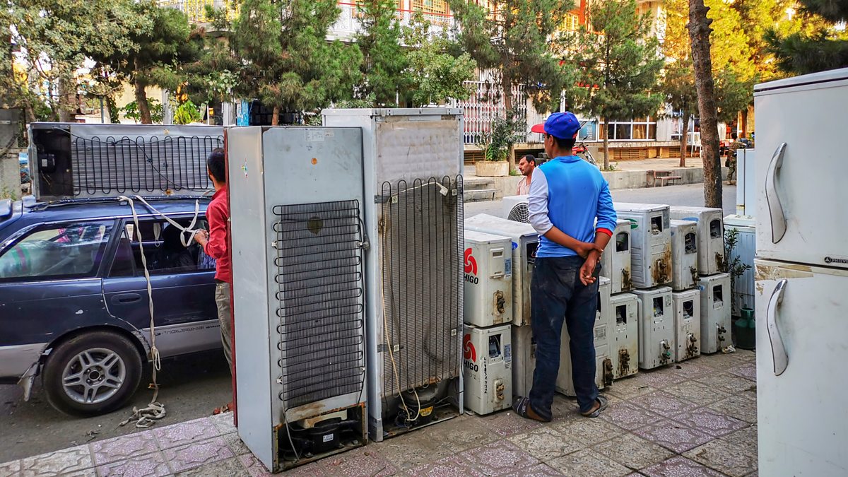 (Photo: A man selling used household appliances in a street in Kabul, Afghanistan, in 2020. Credit: Getty Images)