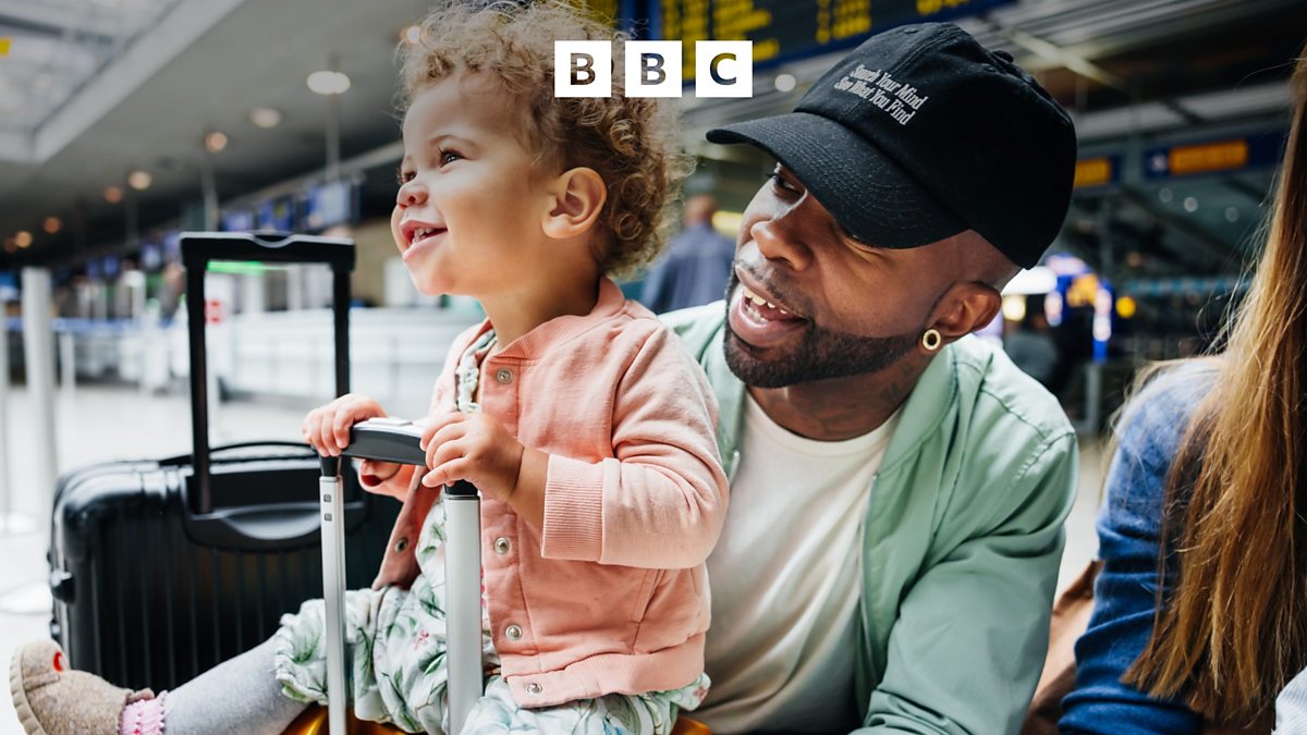 (Photo: A cheerful toddler sits on top of a suitcase, enjoying a playful moment with her father at the airport. Credit: Getty Images)
