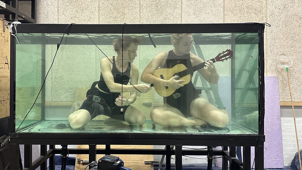 (Photo: Caroline Steel and Nanna Bech in an Aquasonic aquarium playing a guitar)