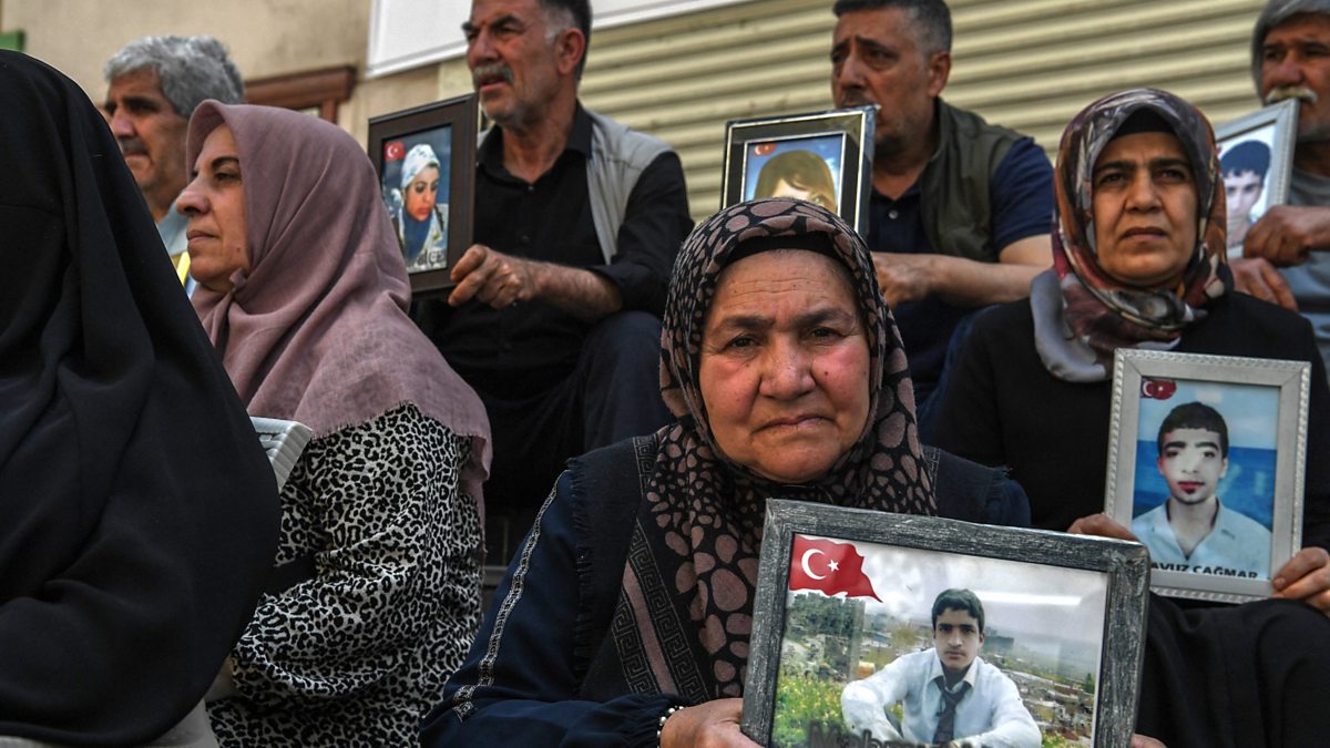 Image: Families whose children joined the PKK (Kurdish Workers Party), hold their images as they sit in front of the headquarters of the Equality and Democracy (DEM) Party after the PKK announced its dissolution, in western Turkey. (Photo by ILYAS AKENGIN/AFP via Getty Images)