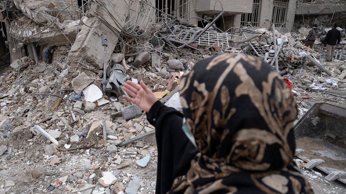 (Image: An Iranian woman gestures while standing on the ruins of a building destroyed during the U.S.-Israeli military campaign , in Tehran, Iran. Credit: Morteza Nikoubazl/NurPhoto via Getty Images)
