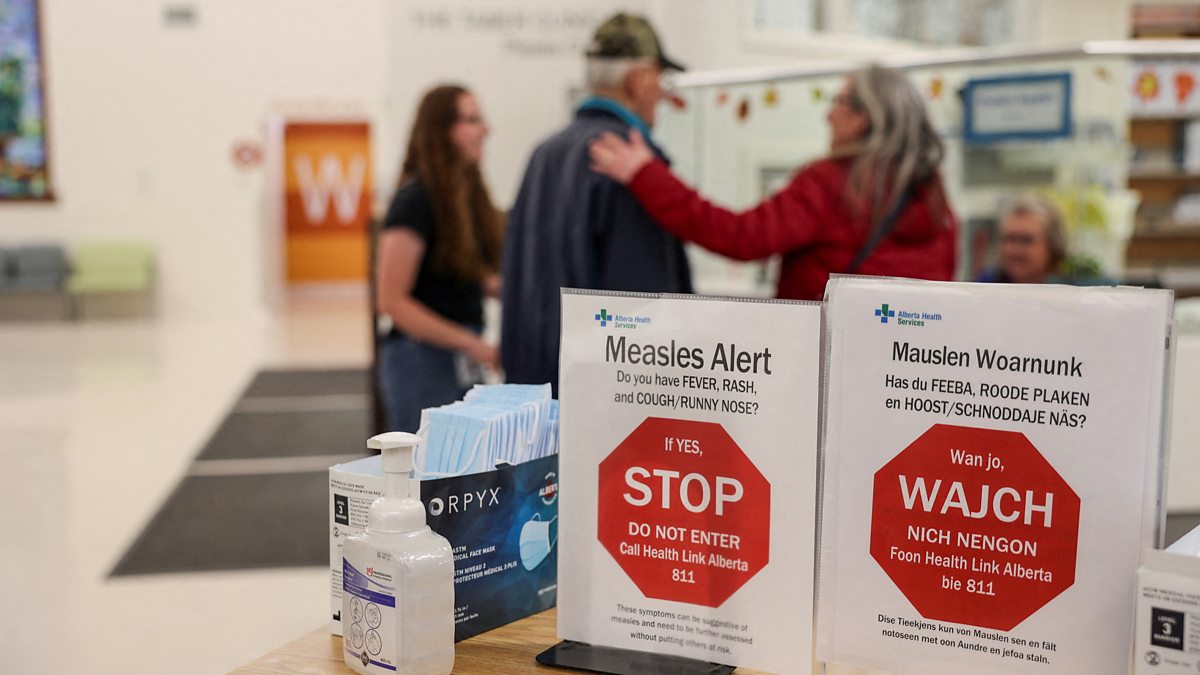 Image: People stand near healthy awareness posters related to the measles outbreak during a public health awareness campaign, at the Taber Health Centre, in the largely Mennonite community of Taber, Alberta, Canada, October 27, 2025. REUTERS/Ahmed Zakot/File Photo