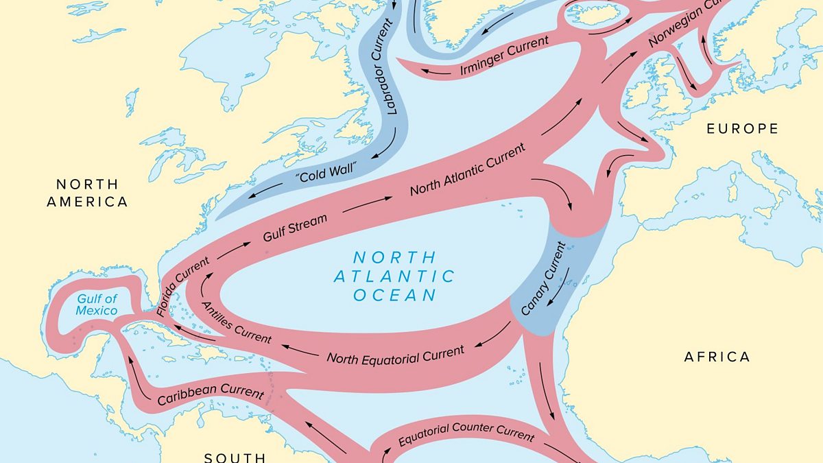 (Image: Map of North Atlantic Ocean currents, with Gulf Stream and other currents. Credit: PeterHermesFurian Via Getty Images.)