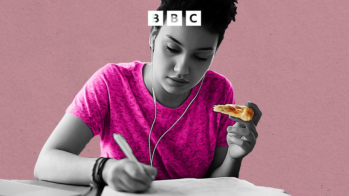 (Image: a woman studying and eating a slice of pizza whilst wearing headphones. Credit: Getty Images/ BBC)