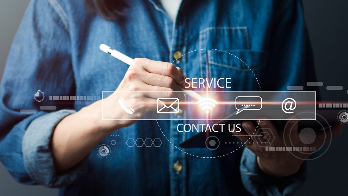 (Photo: A woman in jeans interacting with virtual contact icons on a screen. Credit: Umnat Seebuaphan/iStock/Getty Images)