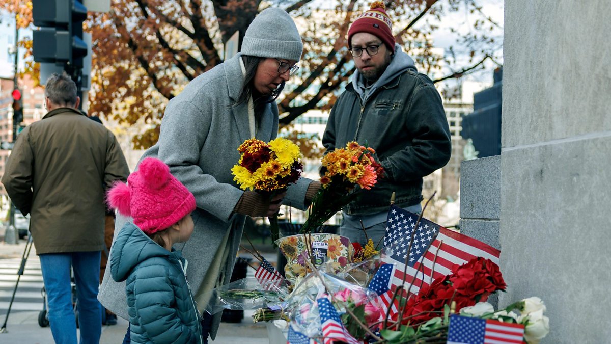 Photo: People leave flowers at the scene where two National Guard members were shot in Washington DC. Credit: Will Oliver/EPA/Shutterstock