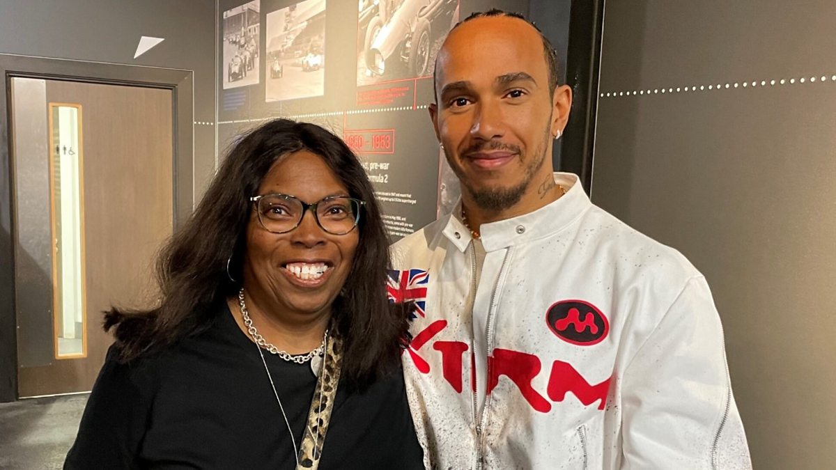 (Photo: Carol Glenn with Sir Lewis Hamilton. Credit: Carol Glenn)