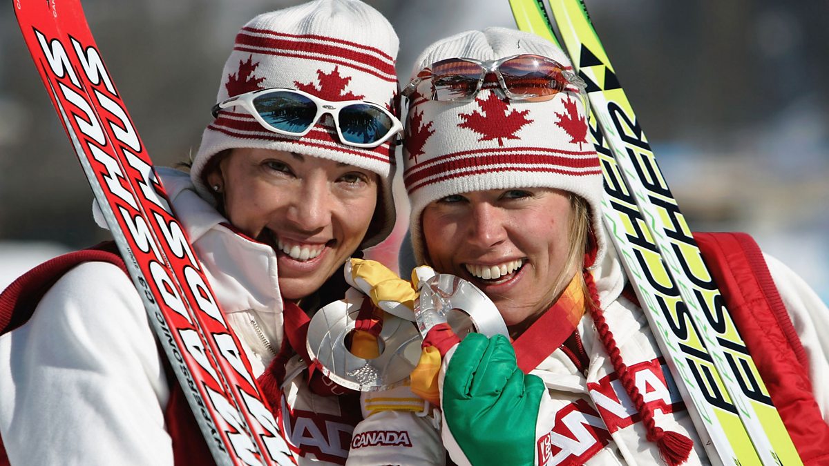 Photo: Beckie Scott and Sara Renner of Canada celebrate winning the Silver Medal for finishing second in the Women's Cross Country Skiing Team Sprint on Day 4 of the 2006 Turin Winter Olympic Games on February 14, 2006 in Pragelato Plan, Italy. (Credit: Bongarts/Getty Images)