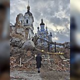 (Photo: Iryna Gould, in a black coat and with her back to the camera, looks at the ruins of a church in Bohorodychne in eastern Ukraine, with the remnants of two large church spires directly in front of her. Credit: Valeria Kostiiushko)