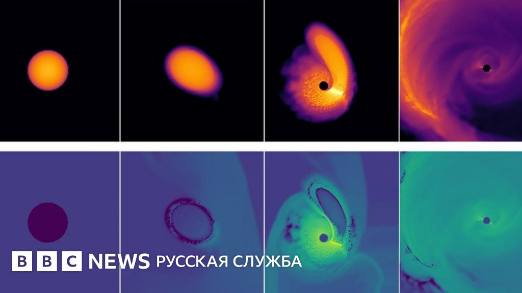 Гравитация приливных сил - наподобие тех, что вызывают на Земле приливы и отливы, только в миллионы раз сильнее, - сплющивает звезду и разрывает ее на куски, а затем черная дыра окончательно пожирает то, что от нее осталось.