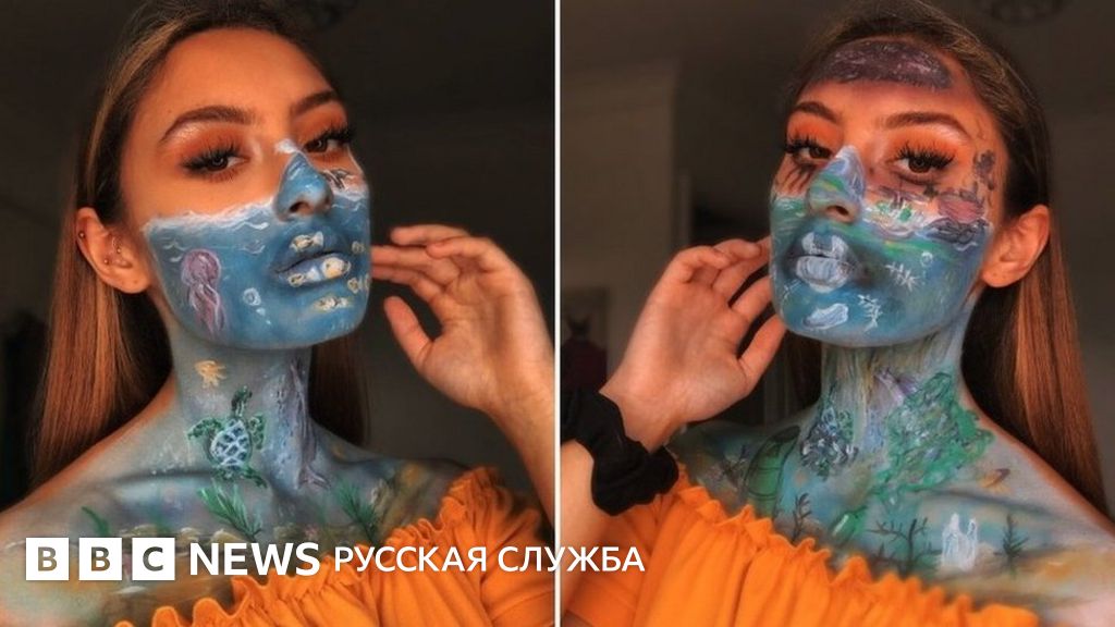 Она нанесла на себя макияж, похожий на чистый океан, а затем заменила его изображением токсичных отходов в воде. Кроме того, на ее лице дельфин запутался в сети, а черепаха - в пластике.