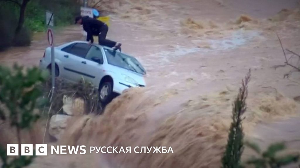 На окраине города мужчина забрался на крышу своей машины, чтобы спастись от потока воды.