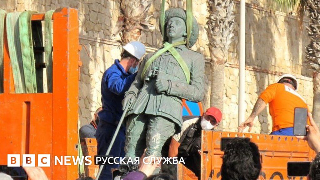 Подпись к фото, Рабочие демонтируют последний памятник Франко, 23 февраля 2021