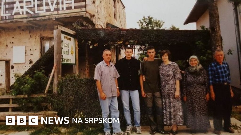Потпис испод фотографије, Породица Колар, у чијем је дворишту тајно изграђен сарајевски Тунел наде. С лева на десно: Отац Бајро, синови Едис и Един, мајка Емина, бака Шида и дека Алија, пред породичном кућом 1998. године