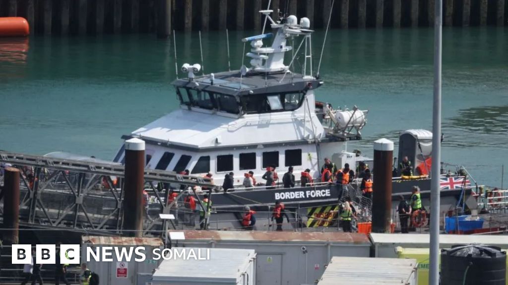 Sawirro la baahiyay ayaa muujinaya tahriibayaasha oo xiran jaakadaha badbaadada oo ka soo degaya doomaha ciidamada xudduudaha ee Dover Arbacadii, taasoo ahayd maalintii ugu horreysay ee qorshaha tijaabada ah uu hirgalo.