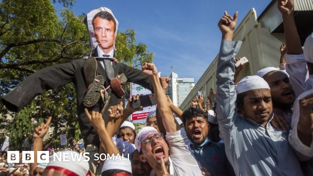 Dibaxayaasha ayaa ku baaqayay in la diido wax soo saarka Faransiiska waxeyna cambaareyn dusha uga tureen madaxweyne Emmanuel Macron.