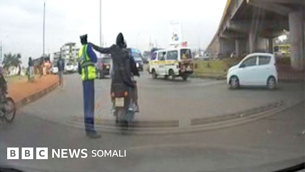 Muuqaal ay duubeen kaameradaha CCTV ayaa muujinaya nin ka tirsan booliska wadooyinka oo kala hagaya gawaari kadibna ay telefoon uu ku hadlayay ka dafeen saddex nin oo mooto saaran.