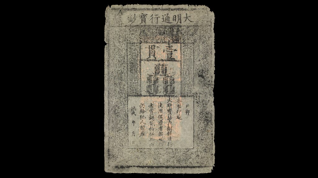 This week Neil MacGregor's history of the world is exploring the great empires of around 1500 - the threshold of the modern era. Today he is in Ming Dynasty China and with a surviving example of some of the world's first paper bank notes - what the Chinese called "flying cash". Neil explains how paper money comes about and considers the forces that underpinned its successes and failures. While the rest of the world was happily trading in coins that had an actual value in silver or gold, why did the Chinese risk the use of paper? This particular surviving note is made on mulberry bark, is much bigger than the notes of today and is dated 1375. The Governor of the Bank of England, Mervyn King, and the historian Timothy Brook look back over the history of paper money and what it takes to make it work. Producer: Anthony Denselow
