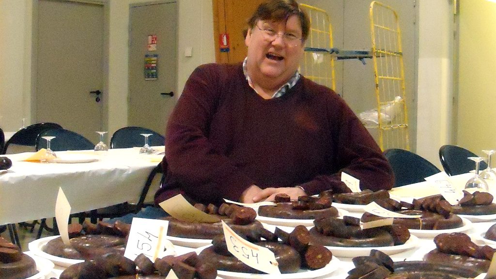 Charles Campion reports from Normandy in France as he helps judge the world black pudding championships, which features entries from Japanese, Austrian and Irish butchers. Each year the "knights of the black pudding", a long established organisation of food lovers, hold the annual Foire au Boudin. Nearly six hundred butchers from around the world enter the competition to help celebrate the ancient dish. As Charles discovers most of the world's great food cultures have some form of blood sausage and they vary in size, shape, texture and flavour. Although we've been making this dish since the arrival of the Romans, many parts of Britain have fallen out of love with the black pudding. The simple recipe of blood, barley, fat, onions and spices is affordable, delicious and a complete meal, and there are signs of a chef led revival. The competition, and the work on display of some extremely creative butchers provides many delicious reasons why this humble food really is worthy of a revival. Young chef and rising star James Winter based in Gloucestshire, also provides some tips on how to cook black pudding. Producer: Dan Saladino.