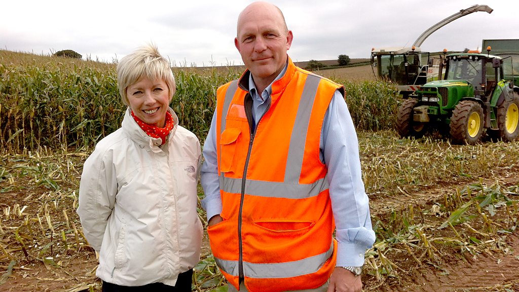 The land surrounding Severn Trent Water's Stoke Bardolph sewage treatment works has been used historically for recycling sewage waste and so cannot be used to grow crops for human consumption, because of contamination. But the farm lies close to the River Trent and is well drained and extremely fertile. In 2010 Severn Trent Water invested £15 million in an anaerobic digester, which is now the UK's largest Energy Crop Anaerobic Digestion plant. Each day 100 tons of crop silage grown on the farm estate is fed into the plant to be anaerobically digested. The silage is converted into methane which is then used to produce 15GWh of electricity a year, equivalent to supplying around 4,500 homes. It also powers the adjoining sewage works. The waste produced at the end of the process makes a good natural fertiliser which is re-applied to the land to help grow next year's crop. The farmer compares the process to feeding a concrete cow. On Your Farm visits the estate as the maize is being harvested, to see this concrete cow at work. Presented by Sybil Ruscoe. Produced by Beatrice Fenton.