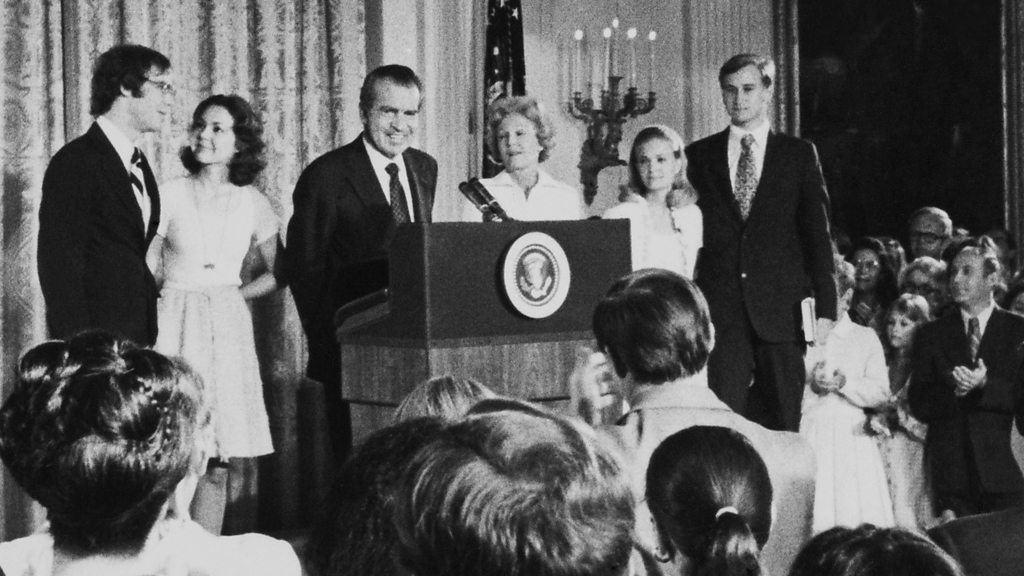 Disgraced President Nixon resigns. His resignation speech does not contain any sort of apology for his misconduct. This archive edition of Letter from America was recorded by one of two listeners, who between them taped and labelled over 650 Letter From America programmes from 1973 to 1989. It was restored by the BBC in 2014.