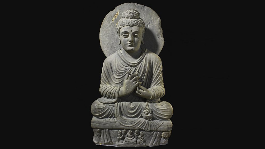 Neil MacGregor continues his series about the expression of shared beliefs with a focus on images which seek to change the viewer's behaviour. A small coloured wood-cut, created in the Netherlands around 1500, offers a particularly gruesome rendering of Christ's crucifixion. Christ is pictured with blood pouring from his torso, his head, his legs and his outstretched arms. These are not realistically arranged droplets; instead we see a flurry of vertical red strokes, tightly packed together and evenly spaced. Neil MacGregor reflects on the purpose of this image. He also considers a serene figure of the Buddha, a halo behind his head, already in his enlightened state. Producer Paul Kobrak Produced in partnership with the British Museum Photograph (c) The Trustees of the British Museum.