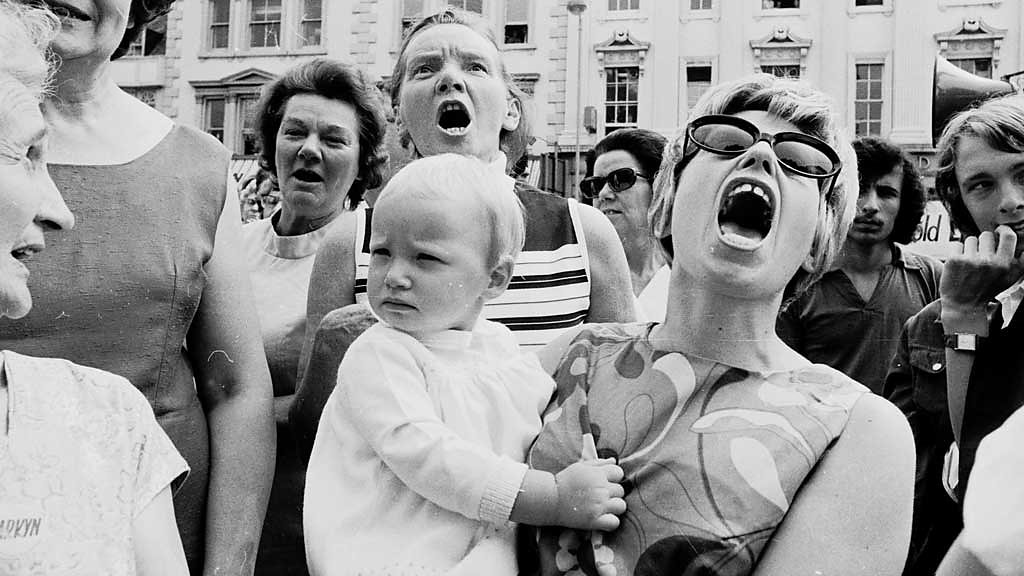 When a group of 500 women met up for the first ever women's liberation conference in the UK, it marked the beginning of modern British feminism. The men looked after the children while the women discussed the politics of housework and childcare in the grand setting of the Oxford Union. Feminist historian Sheila Rowbotham was one of the main organisers, she describes the sense of excitement and joy as women of different ages and from different backgrounds met up to debate issues which they'd previously kept secret. Picture: Women hecklers at a political rally in 1970, Credit: Central Press/Getty Images