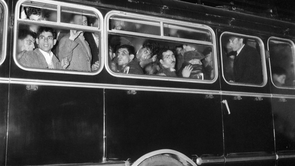 On 17 October 1961, French police turned against Algerian demonstrators in Paris. Some were shot, others drowned in the Seine. For years the killings were not acknowledged. We hear from one man whose sister died that day. (Photo: Demonstrators, arrested during a march by between 20,000 and 30,000 pro-Front de Liberation Nationale (FLN) Algerians, are seen in a bus on October 17, 1961 in Paris. French police attacked the illegal but peaceful demonstration.) (Credit AFP/Getty Images)