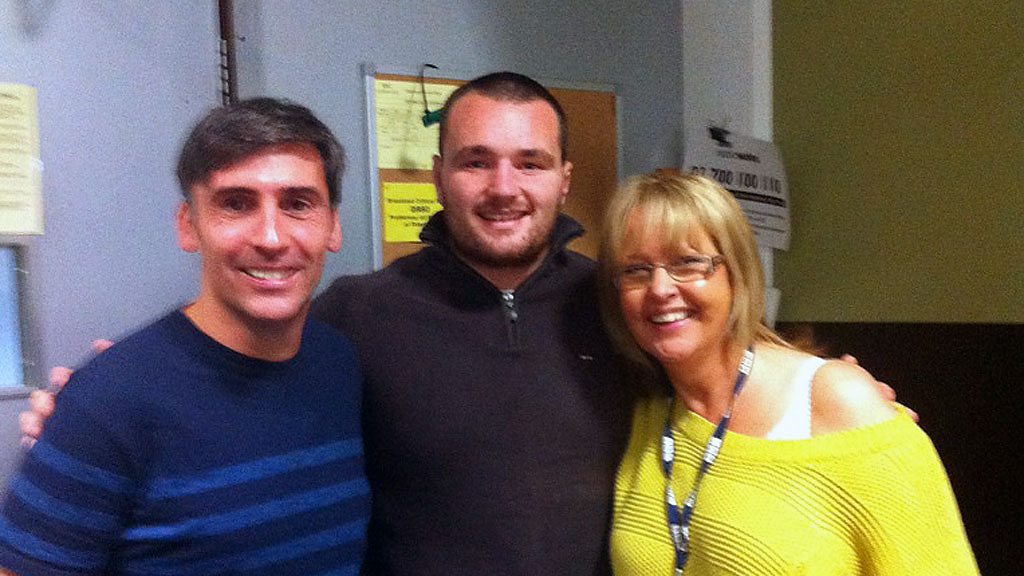 Ken Owens bachwr tim rygbi Cymru yn y stiwdio gyda Dafydd Du a Caryl Parry Jones.