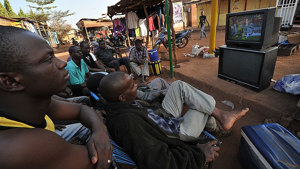 The BBC Africa Debate will discuss current issues that matter to Africa, and bring them to the attention of a global audience. (Image: Men watch football on TV on a street in Mali, Credit: AFP/Getty Images)