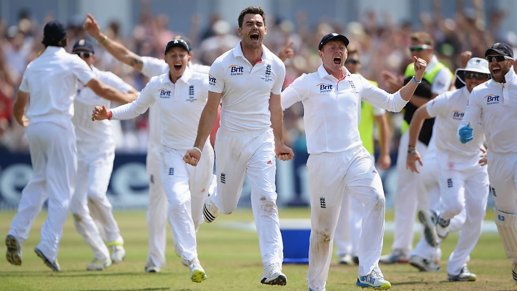James Anderson takes his 10th wicket of the match, as Australia's Brad Haddin is dismissed as decision is overturned