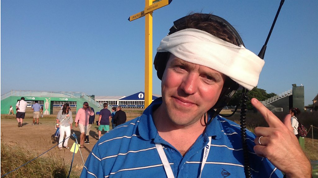 Live recording of the moment golf commentator Alistair Bruce-Ball was hit by Brandt Snedeker's ball, at the Open championship in Muirfield; plus his very understated reaction. Alistair's headphones thankfully took the force.