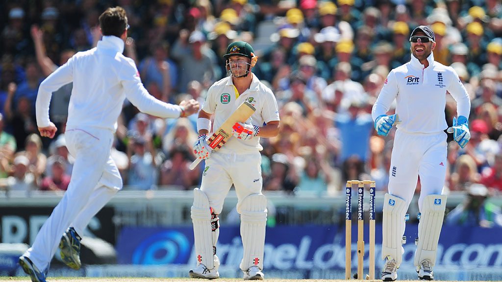 Australia's David Warner is out for for 5, after he mounts an unsuccessful DRS review.