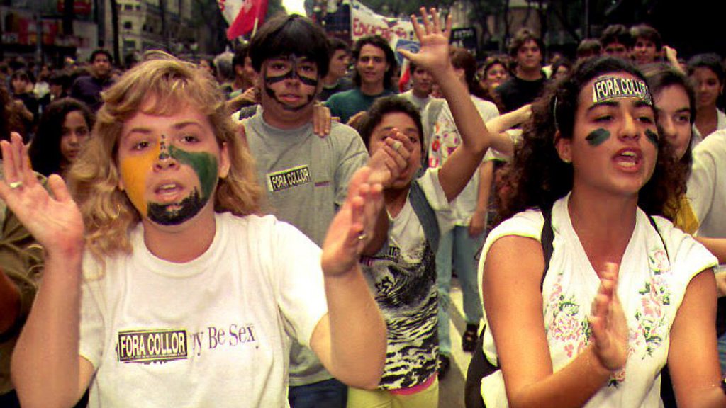 In 1992, President Fernando Collor of Brazil was forced from office by a huge wave of street protests against corruption. The demonstrations were led by students who painted their faces with slogans and the colours of the Brazilian flag. Witness speaks to one of the first members of a movement that became known as Caras pintadas, meaning the Painted Faces. Picture: Students with painted faces protest, Credit: AFP/Getty Images