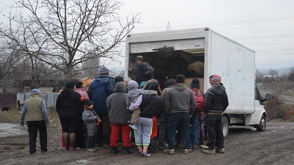 Families living in Riverside, Hunedoara receive their Christmas shoebox.