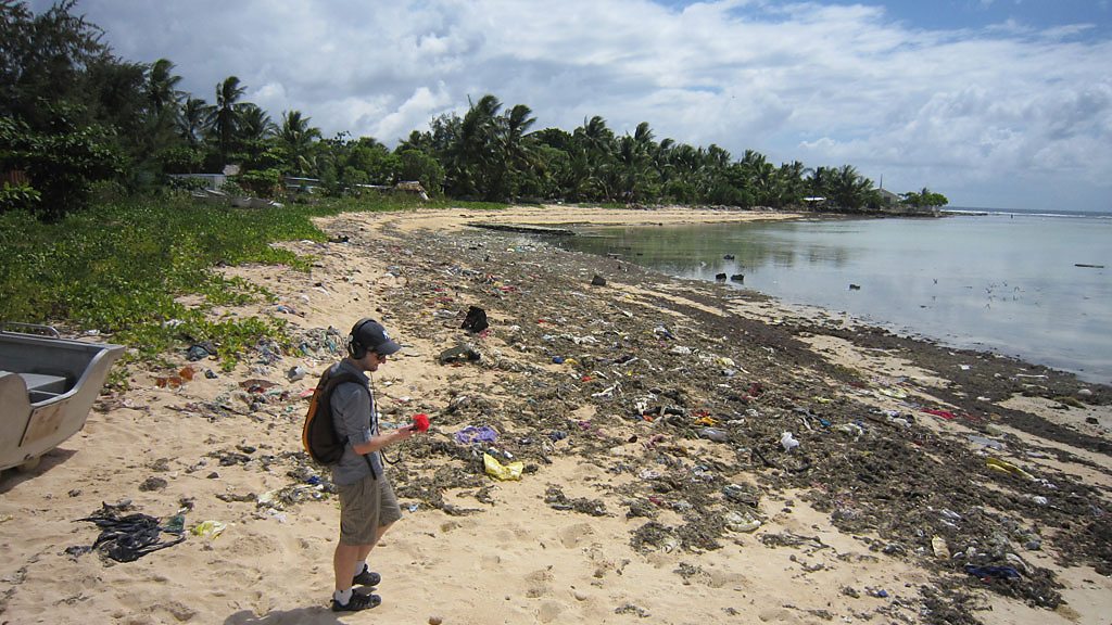 Saving the Ocean looks at the impact of climate change, overfishing and pollution - and examines the scientific solutions to some of those issues. In the first programme Joel Werner visits Kiribati – an isolated Pacific island group threatened by rising sea levels. They are also facing a range of more immediate problems - a high human population and a shortage of land puts pressure on natural resources. Joel meets the scientists working to keep the population afloat on these tiny coral atolls. He finds out about how this island group is threatened by sea level rise and changing weather patterns - and how in some cases, poor sea defence management is making the erosion of the islands worse. (Image: Low tide reveals the detritus of 50,000 people on South Tarawa, Kiribati, BBC copyright)