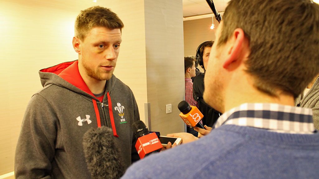 Rhys Priestland yn sgwrsio gyda Huw Llywelyn Davies cyn gêm Iwerddon.