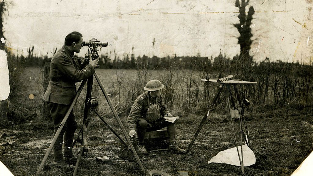 The Southampton-based Ordnance Survey played a vital role in World War One. In January 1915, it began a new survey of British sectors in France to replace existing French maps, which were found to be inaccurate and too small in scale. Over the course of the war it printed at least 25 million battlefield maps for use by British troops. In Southampton, printing presses ran round the clock, supplying up to 20,000 maps a day. In 1917, an Overseas Branch of the Ordnance Survey (OBOS) was established in Northern France to facilitate map production. Both offices employed a substantial number of women, mainly to feed paper to the machines. At the front, Ordnance Survey officers and the Field Survey Units of the Royal Engineers refined techniques to direct fire onto enemy guns. ‘Flash-spotting’ and ‘sound-ranging’ involved the recording of the flash or report of gunfire at triangulation points, enabling Survey Officers to plot the guns’ location. Captain Harold Winterbotham, who later become Director General of the Ordnance Survey, was nicknamed ‘The Astrologer’ by gunners for his ability to hit distant targets using the correct line of fire and elevation. Location: Southampton, Solent SO15 2XQ Image shows a team 'flash mapping' during map-making, which is fixing or trying to identify some points of interest – often the location of artillery fire which is called Ranging. The ‘plane table’ which they are using would have mapping on it and they would be trying to locate where the enemy is (particularly difficult in trench warfare). Image courtesy of Ordnance Survey Presented by BBC Reporter Marcus White