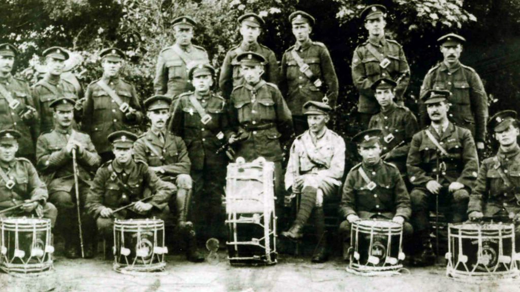 St Columb's Cathedral in Londonderry is a popular place of worship. It is also home to some historic military regalia, including a remarkable bass drum. This drum was carried to the Somme in France, the scene of one of the most famous battles of the Great War, by members of the Hamilton Flute Band. Band members are believed to have enlisted en masse when war broke out. They became the regimental band of the 10th Battalion, The Royal Inniskilling Fusiliers. Their flutes and drums accompanied the soldiers as they marched hundreds of miles - first to their training camps and then to the Western Front. When the 'Derrys', as they were known, went to France the band members became stretcher bearers. They witnessed the full horror of war at the Battle of the Somme, and their bass drum and side drums were used as a communion altar. The term 'drumhead service' has its origins in this practice. 66 members of the band lost their lives in the course of the war. The survivors returned home with the bass drum, and in the 1970s the band donated their full set of drums to St Columb's Cathedral where they are on display in the Chapterhouse. In 1996 the Hamilton Flute Band returned to France to play at the commemoration of the 80th anniversary of the Battle of the Somme. They brought the old bass drum, and it served as a communion altar once more during a service at the Ulster Tower. The band, and the drum, may return to the Somme in 2016 to mark the centenary of that historic battle. Cathedral historian Ian Bartlett and two band members recount the drum's story. Location: St. Columb's Cathedral, Derry, BT48 6RQ Image of the Hamilton Flute Band serving as the 10th Battalion Service Band of the Royal Inniskilling Fusiliers in France, circa 1915 Photograph courtesy of the Hamilton Flute Band, Londonderry