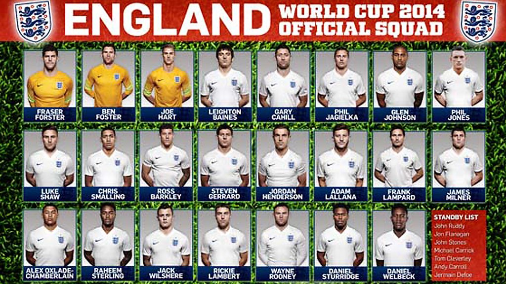 England's 23-man squad has the ability to reach the semi-final's of the World Cup, former captain Alan Shearer has said. England manager Roy Hodgson has revealed the player's he will be taking to Brazil for the tournament which begins in June. Shearer said striker Wayne Rooney "needs to have a big tournament for people to speak about him in the same terms as Ronaldo and Messi". The full England squad is Joe Hart (Manchester City), Ben Foster (West Brom), Fraser Forster (Celtic); Glen Johnson (Liverpool), Phil Jagielka (Everton), Gary Cahill (Chelsea), Chris Smalling (Manchester United), Phil Jones (Manchester United), Leighton Baines (Everton), Luke Shaw (Southampton); Steven Gerrard (Liverpool, capt), Frank Lampard (Chelsea), Jordan Henderson (Liverpool), James Milner (Manchester City), Jack Wilshere (Arsenal), Ross Barkley (Everton), Adam Lallana (Southampton), Raheem Sterling (Liverpool), Alex Oxlade-Chamberlain (Arsenal); Wayne Rooney (Manchester United), Daniel Sturridge (Liverpool), Danny Welbeck (Manchester United), Ricky Lambert (Southampton).