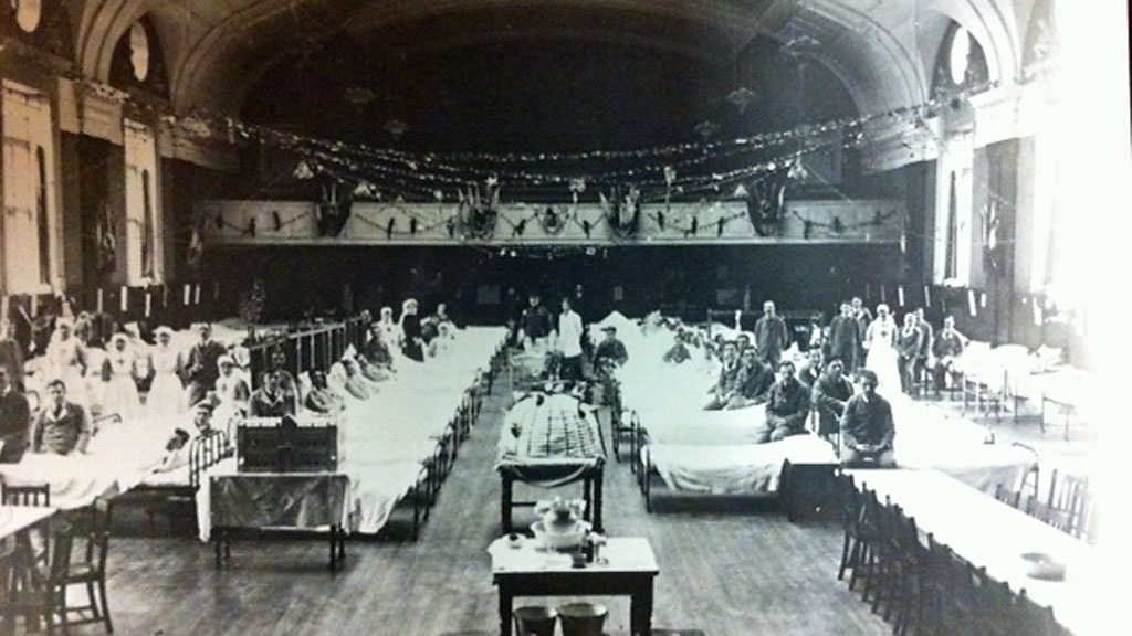 Agatha Christie spent World War One in Torquay. She served as a nurse at the Red Cross Hospital in the Town Hall, which is when she began her first novel. Agatha Christie (Agatha Miller as she was at the start of the war) started work at the Torquay Town Hall hospital in October 1914. According to her Red Cross service record she gave 3,400 hours. She also worked in the hospital’s dispensary and it was here that she learned about poisons. In 1917 she took the Apothecaries Hall exam. Aged 84, in an interview with the Imperial War Museum she recollected her experiences in the hospital during the war. She describes writing letters to the girlfriends of wounded servicemen, walking others to X-rays, feeling ill whilst watching a stomach operation, cleaning up after amputations and learning about poisons. She also records her sadness at the death of one soldier she cared for. Agatha Christie began her first novel, The Mysterious Affair at Styles, in 1916. The plot unfolds with the detective, Hercule Poirot, is a Belgian refugee, Captain Hastings is convalescing from the war and the victim raises money for the war effort. Agatha married Archie Christie, a Royal Flying Corps pilot, on Christmas Eve 1914. World War One and Torquay’s Town Hall hospital were instrumental in inspiring her writing. Location: Town Hall, Torquay TQ1 3DS Photograph of Torquay Town Hall during the war courtesy of Torbay Library Services