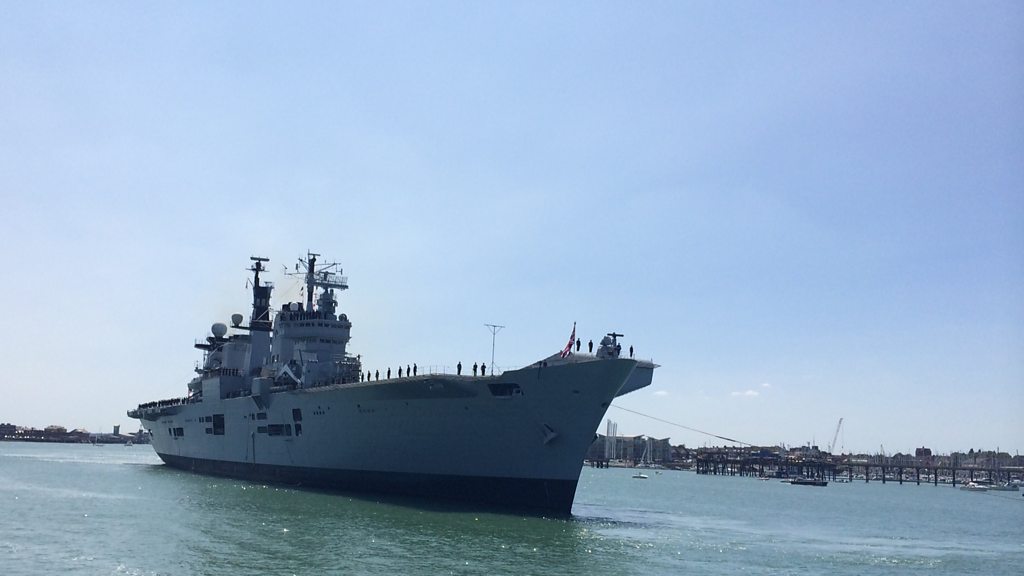 HMS Illustrious has come home to Portsmouth for the final time today, drawing to an end her proud 32-year career. The old aircraft carrier clocked up nearly nine hundred thousand miles on operations throughout the world, and is now being withdrawn from service. Well wishers lined the seafront in Southsea and gathered at the round tower in Old Portsmouth to watch her arrival into her home port this lunchtime. BBC Radio Solent's reporter Neil Sackley was dockside as she pulled alongside.