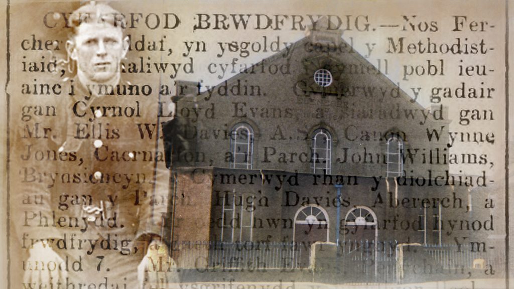 Beryl Harris sy’n dweud hanes torcalonnus ei nain yn erfyn ar ei mab hynaf, Griffith Jones, ewythr Beryl, i beidio ymuno â’r fyddin wrth iddo dorri ei enw yn y llyfr ymrestru mewn cyfarfod recriwtio yn ysgoldy Capel Ebenezer, y Ffôr, yn 1914. Cafodd Griffith ei ladd yn y cyrch enwog ar Goed Mametz yn 1916 – un o frwydrau’r Somme a laddodd nifer fawr o Gymry’r 38th Welsh Division. Roedd Griffith a chwech arall wedi eu hysbydoli i ymuno yn y fan â'r lle wedi i'r Parchedig John Williams siarad yn y cyfarfod. Yn ôl hanes y teulu fe gafodd mam Griffith orchymyn gan y gweinidog i fod ddistaw a gadael i'w mab wneud ei benderfyniad ei hun tra roedd hi'n ymbil arno drwy ei dagrau. Yn ôl Beryl Harris, ni aeth ei nain, mam Griffith, ar gyfyl capel wedi hynny. Roedd John Williams yn weinidog dylanwadol oedd yn un o arweinwyr ymgyrch Lloyd George i recriwtio bechgyn Cymru i’r fyddin. Mae’r stori yma yn cael ei dweud yn y llyfr ‘Epil Gwiberod yr Iwnion Jac’ gan Geraint Jones hefyd, un arall o deulu Griffith Jones. Mae’n dweud: “Ar fwrdd y cymun fe daenwyd lliain gwyn, yn arwydd sacramentaidd o gysegredigrwydd y weithred o listio. Gerllaw, a’i phwys ar ganllaw y sêt fawr, erfyniai Nain druan, yn ei dagrau, ar i’w mab beidio â thorri ei enw ar y Llyfr Listio. ‘Paid â mynd, Guto bach, mi lladdan nhw di’. Arthiodd y duwiol Frynsiencyn arni i gau ei cheg, a pheidio â busnesu … Yno yng ngŵydd y Porthmon, y torrodd f’ewyrth ei enw, ei ddedfryd marwolaeth ei hun.” Lleoliad: Capel Ebenezer, Y Ffôr, Pwllheli, Gwynedd, LL53 6UP Llun: Darn o bapur Y Genedl Gymreig ar 6 Hydref 1914 drwy wefan 'Papurau Newydd Ar-lein' y Llyfrgell Genedlaethol; Griffith Jones drwy garedigrwydd Casgliad y Werin a Chapel Ebenezer, cyn iddo gael ei ddymchwel, gyda diolch i Alun Williams, y Ffôr ac ysgrifenyddes y capel presennol.